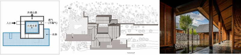 李晓东在淼庐设计过程中既吸纳了古代合院的营建观,又运用了现代建筑设计方法。场地选址遵循“负阴抱阳,背山面水”的原则,巧妙地将建筑与山水环境相呼应,建筑背靠玉龙雪山,面向自然湖泊。设计构思中,运用了穿插的水体与路径迂回的方式呈现出古代“相地”与“藏风纳气”的堪舆观念。