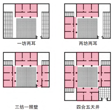 将“一坊两耳”、“两坊两耳”、“三坊一照壁”,以及“四合五天井”合院形制作为一个生成过程,其形式结构呈现出由从个体走向整体,从开放走向封闭,从偏向一隅走向完形匀质。