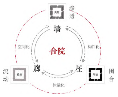 合院民居在自然环境与社会文化影响下形成了一套成熟完备的建构体系,具有空间自身组织逻辑的合院属性和以宗族或家庭血缘为架构关系的家宅属性,隐含着不同的地域文化逻辑,成为当代合院重构创作的出发点。