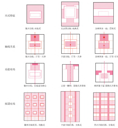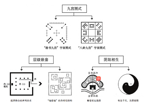 受儒家、道家哲学思想影响下所追求的“人-建筑-环境”互融共生关系,从空间结构、组织秩序、虚实关系 3 个层级,可分别提炼出“九宫”宇宙图式、层级嵌套图式、“阴阳”相生图式。