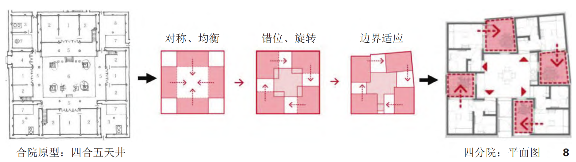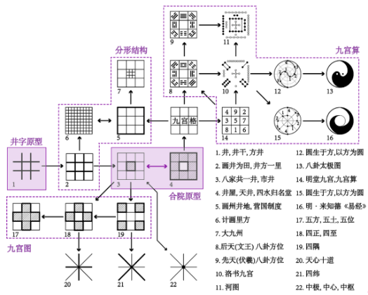 王其亨详细论述了中国传统建筑平面构成原型及文化渊涵, 从形而上的视角分析“井” 字平面原型, 指出“井字形和九宫型图式具有空间构成上的完形性意义”。合院形式亦具有“井字形” 分形层级,随着尺度的缩放,范围与类型亦随之变化。