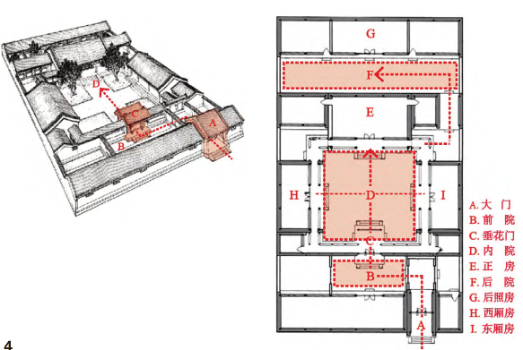 在单一的合院中,庭院和建筑物通常作为一个整体而设计,按“院落”布局突出的是“墙”的边界实体和起承转合的空间序列关系。