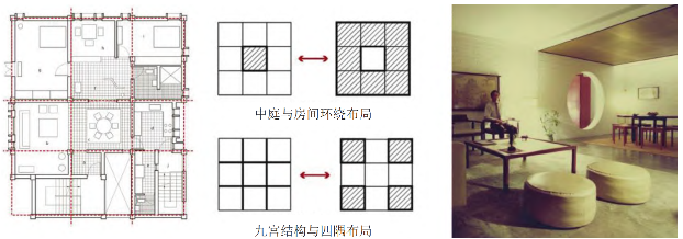 在中国传统合院的九宫格布局中,通常院落居于正中,是一种“虚”空间。而王大闳设计的虹庐别墅则将其置换为餐厅,是一个具有功能性的“实”空间,挪用了九宫格概念,却又赋予新的诠释。从隐喻的角度,同样是汇集的功能,餐桌的设置使人在四周移动,仿佛回到中国合院院廊的空间经验。虹庐的平面有严谨的九宫格逻辑,左上角变为小庭园,其空间界面的处理则通过月洞窗、月洞门、门洞,将中国庭园概念幻化在现代住宅空间里。