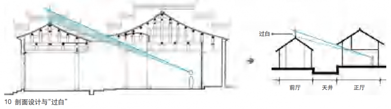 合院中后厅屋檐下的景框设置、前厅的屋脊天际线,以及远处的山形、上方的蓝天白云,在不同的位置观赏所形成的视景在不断的变化中。笔者将之称为夹景的艺术,即运用近景之框、中景之脊,以人的视觉为中心营造前后相“夹”的过白处理手法。“过白夹景”的营建依据人的行为路径、观景方式巧妙地处理了人、单体、合院组群与自然环境、营造技术与视觉艺术之间的关系。